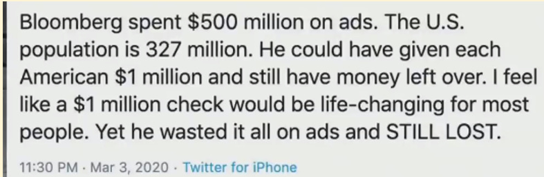 On March 6, 2020 MSNBC anchor Brian Williams and New York Times writer Mara Gay spoke with outrage about this twitter post which they both emphatically represented as true.